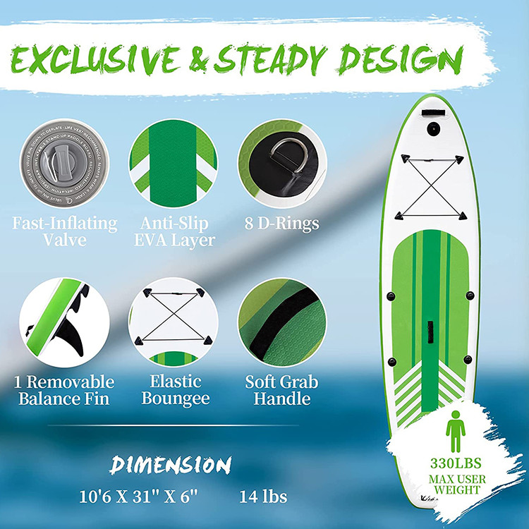 - [परफेक्ट ड्रॉप स्टिच]बेहतर सामग्री और गतिशीलता - उच्च गुणवत्ता वाले पीवीसी सामग्री, हल्के और उच्च तीव्रता से बना है।Huarui उद्योग में सबसे कठिन ड्रॉप स्टिच सामग्री का उपयोग करता है।उच्च-तीव्रता परत विशेष रूप से बेहतर वायु धारण के लिए निर्मित। यहहुआरुई inflatable स्टैंड अप पैडल बोर्ड 280 पाउंड की वजन क्षमता के साथ एक ऑल-अराउंड मल्टीफंक्शनल बोर्ड है, जो योग, मछली पकड़ने, सर्फिंग या बच्चों और पालतू जानवरों को ताजे और खारे पानी दोनों में एक साथ ले जाने के लिए उपयुक्त है!